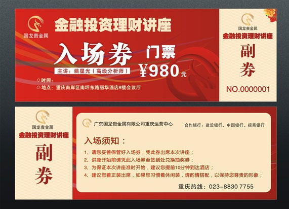 目前常用的入场券纸张有铜版纸和哑粉纸,这些常用纸张满足了80%以上的客户需求。我们还提供上百种特种纸张供您选择。