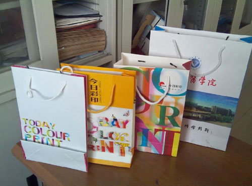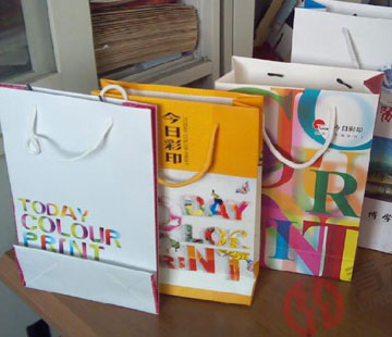 纸质手提袋印刷后需覆膜或穿绳后方可成形,手袋的绳子可选用尼龙绳、棉绳或纸绳。如手袋尺寸较大时,需在绳孔处加固铆钉以抗拉力。